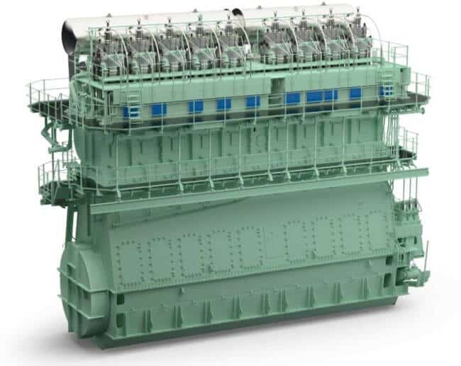 The X40DF, low-pressure, dual-fuel engine is available in 5 to 8 cylinder configuration, covering a power range from 2,775 kW to 7,480 kW, at 104 to 146 rpm.