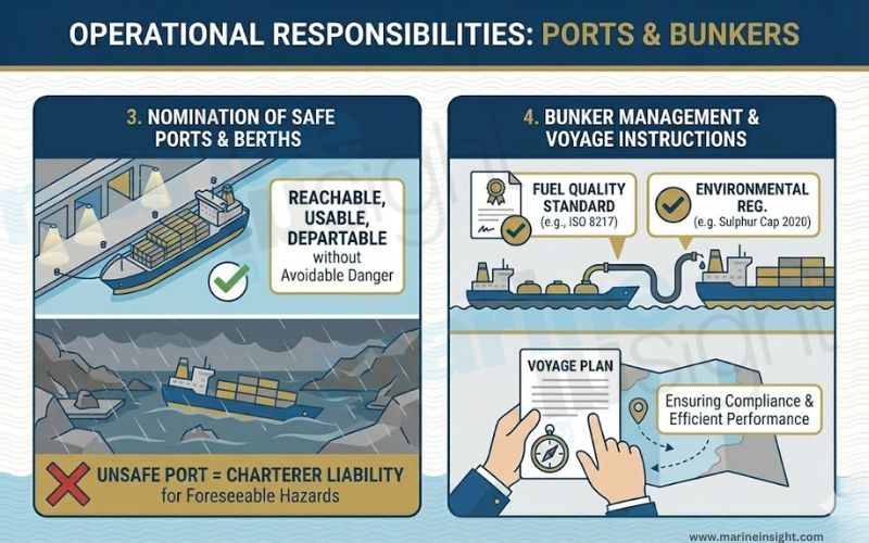 A critical operational responsibility of charterers is the nomination of safe ports, berths, and anchorages. A port is considered safe if the vessel can reach, use, and depart from it without being exposed to avoidable danger. If a charterer directs a vessel to an unsafe port and damage occurs, liability may rest with the charterer, particularly where hazards were foreseeable or inadequately assessed.