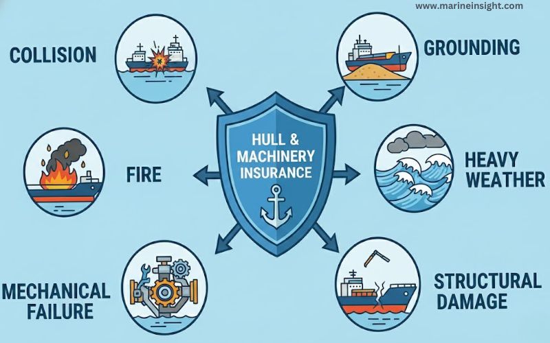 Hull and Machinery insurance provides cover for physical damage to a vessel itself. This includes damage to the hull, engines, and onboard machinery caused by perils such as collision, grounding, fire, heavy weather, or mechanical failure.