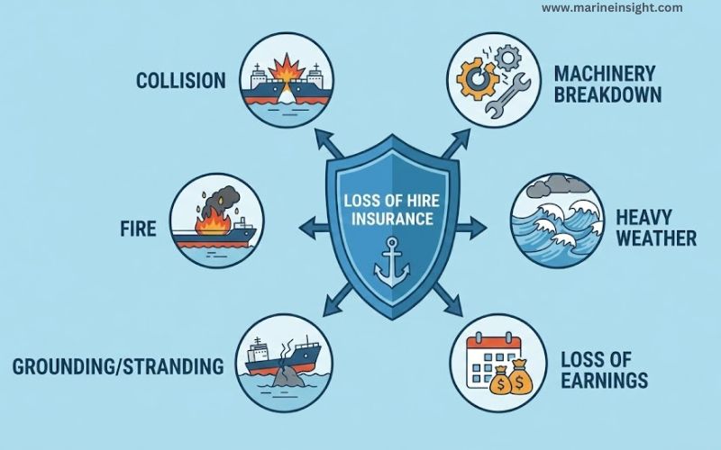 Loss of Hire insurance focuses on income rather than physical damage. When a vessel is rendered inoperable due to an insured peril—such as collision, machinery breakdown, or fire—this policy compensates the assured for loss of earnings during the repair period.
