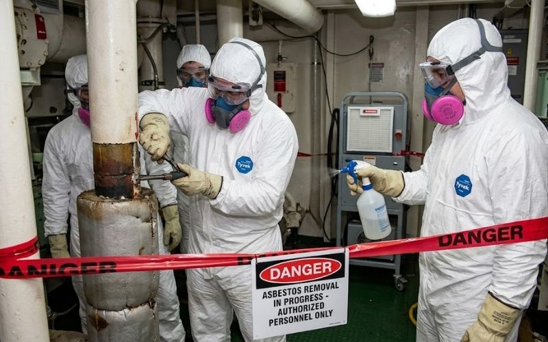 Workers involved in handling asbestos components during the ship recycling process must wear disposable, impermeable coveralls such as Tyvek suits, gloves, goggles, and boots. They must also use NIOSH-approved respirators to prevent inhalation of the asbestos fibres. All such clothing is finally disposed of as hazardous waste.