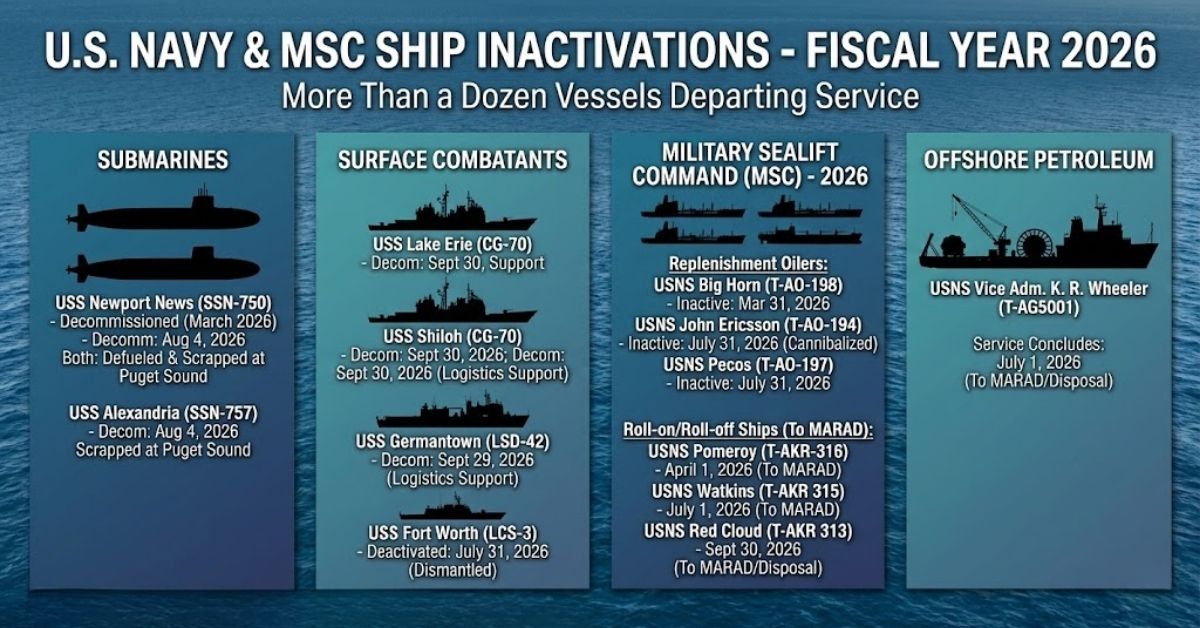 The U.S Navy’s 2026 ship inactivation schedule was released last week. Per the document, over a dozen battleships and support vessels will be bidding farewell to the U.S Naval Forces this year.