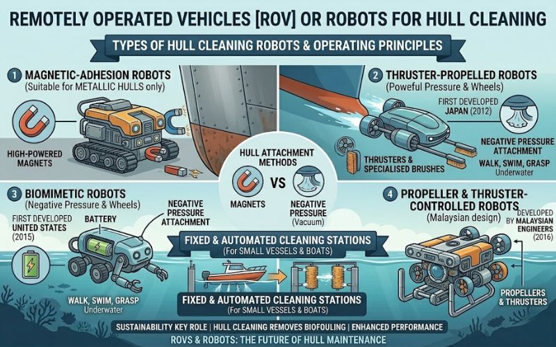 Neptune Robotics, Fleet Robotics, Ecosubsea, Hullbot, Hull Wiper, etc., are some of the leaders in hull cleaning technology.