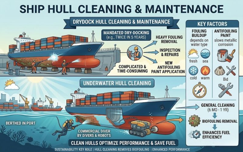 Hull cleaning is a complicated and time-consuming process. Ships are usually mandated to be drydocked for maintenance, servicing, and hull cleaning at least twice in 5 years. While dry-docked, the hull of a ship is cleaned and antifouling paint applied.
