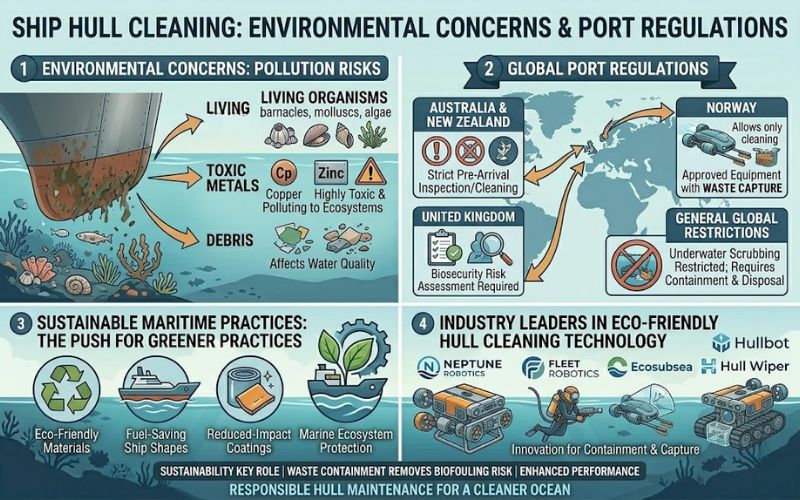 In general, underwater scrubbing of hulls is restricted by most countries. Others require cleaning systems that can contain the discharge and capture it for proper disposal.