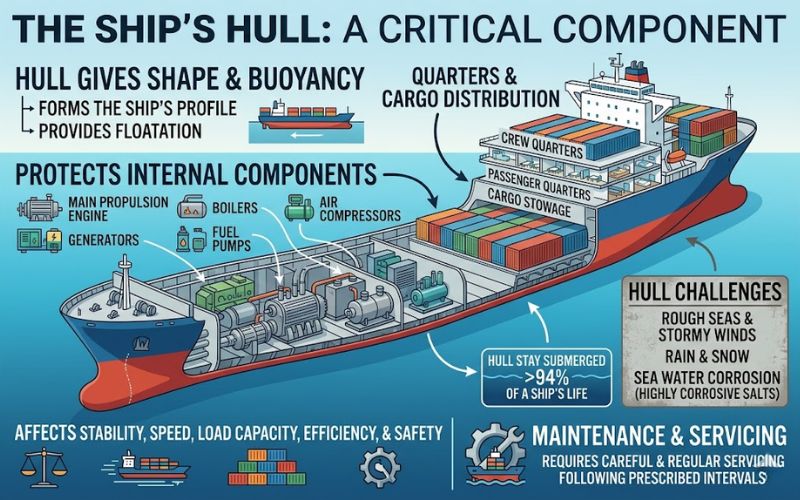 The hull of a ship gives it its shape and buoyancy and protects the parts and components inside. A ship’s main propulsion engine, generators, boilers, fuel pumps, air compressors, and other such equipment are all located within the hull of a ship.