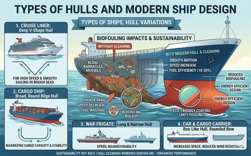Modern ship hulls are designed and made with sustainability playing a key role alongside design and structure. Modern hull designs are energy-efficient and eco-friendly, e.g., coatings and paints used to reduce biofouling.